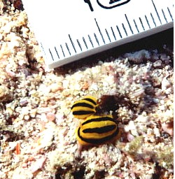 TOP RIGHT: North Male Atoll, Himmafushi Is., divesite "Rainbow Reef" 24 m, size 11 mm, Oct. 27, 1999. this one was found with the red sponge. BOTTOM RIGHT: South Male Atoll, Guraidhoo Is., divesite "Guraidhoo Kandu", 23m, size 9 mm, Oct. 24, 1999. BOTTOM LEFT: South Male Atoll, Guraidhoo Is., divesite "Guraidhoo Kandu", 21m, sizes 7, 9 mm, Oct. 24, 1999. Maldives Islands.