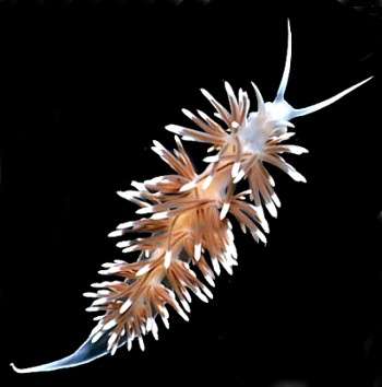 The general ground color is translucent white and the visceral mass is pale pink and readily seen through the body surface. The distal parts of oral tentacles and rhinophores are opaque white. The digestive gland lobes, visible within the translucent cerata, are reddish orange to yellowish orange. The cerata are capped with wide subapical rings of opaque white, epidermal pigment. The jaws, visible through the translucent skin, are reddish orange. Grows up to 64 mm in length. The foot comers are tentacular and the frontal margin of the foot is transversely grooved. The oral tentacles and rhinophores are both smooth, and the former are thicker and longer than the latter. The tail is rather long, being one-third to a quarter of the body length. The cerata are arranged in multiple rows in horse-shoe shaped clusters.