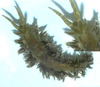 LOWER: North Reef, Dar es Salaam, Tanzania. September 1973, 45mm long. NOTE the cerata in lower animal proportionally much smaller. The ceratal size can change very quickly and apparently reflects changes in the physical well-being or physiology of the animal. PHOTOS: Bill Rudman.