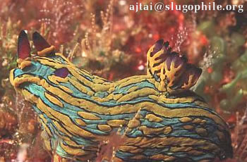 Tambja abdere and Tambja fusca were described in the same paper (Farmer, 1978) but are now considered to be colour variants of a single species. The basic body coloration consists of turquoise blue-green and yellow-ochre regions, separated by black lines. In some specimens, such as in the accompanying photo, colour pattern is quite orderly with a turquoise background and longitudinal bands of yellow ochre, separated by thin black lines. In the T. fusca form the yellow ochre predominates and the turquoise consists of a series of irregular spots and patches. The gills and rhinophore clubs are a dark brownish black, and the outer edge of the gill rachis is yellow. There is a very distinctive translucent dark patch behind each rhinophore above where the eye is situated on the nerve ring. Animals grow to 80 mm in length, and are often found on their food - arborescent bryozoans. They are often eaten by Roboastra tigris.