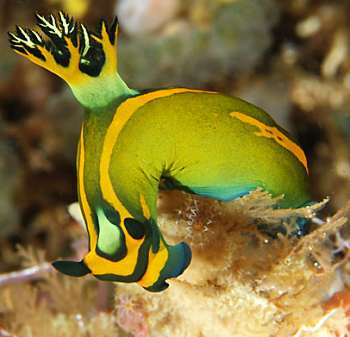 Known only frrom the holotype and some photographs from the Maldives, the is species is characterised by its dull 'olive' green background colour and pattern of black and orange-yellow markings. The black and yellow pattern is quite variable but its major elements consist of a yellow band that runs a round the anterior end, just in from the dark green edge, then runs back on each side to join behind the gills. Parts of this band can be absent, and at the posterior end, the join behind the gills it forms quite an acute angle. There are a pair of black patches just behind the rhinophores. The raised rhinophore pocket is yellow with a black border. The rhinophore club is black. The gills are yellow on the outer face with black lamellae. There are traces of a yellow submarginal band around the edge of the foot. This becomes very distinct at the posterior end of the foot which also has a black patch. Yonow (1994) notes that this animal was found on the arborescent bryozoan Bugula dentata and the collector (S. Harwood) reported that it exuded masses of green pigment when touched and produced an acid like burn on the collector's hands.