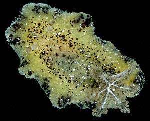 The dorsum is translucent yellow with a characteristic pattern of dark brown patches around the mantle edge, while the underside is a bright orange yellow with small brown spots on the underside of the mantle and the sides of the foot. The dorsum is tuberculate and some of the larger tubercles have a long tapering fluid filled papillae.