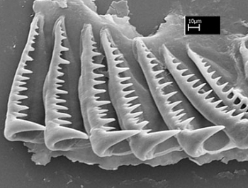 Upper: A 35574, South Africa, 7 mm. Photo: T. Gosliner. Lower: CASIZ 172881. Radular morphology. Scale =10 µm. [From Gosliner & Fahey 2008: Fig. 14B].