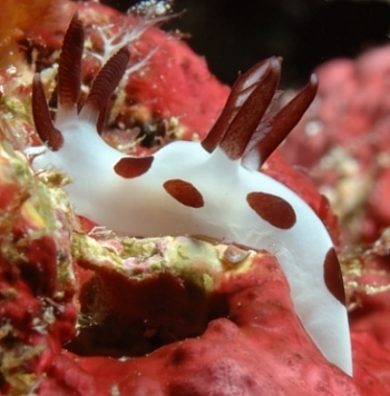 The body is translucent white with large rounded spots of dark brown or black scattered over the body. The anterior tentacular foot corners are white, but the oral tentacles, the dorso-lateral processes, the rhinophores and the gills are dark brown or black except for a short white basal region.
