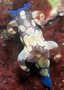 The background colour of the body is a translucent purple or lavender, deepening to an opaque blue on the head and posterior tip of the body/ foot. There are larger white rounded patches scattered in what appears to be a regular and symmetrical pattern on the body. There are 5 along the midline between the front of the head and the gills and three behind the gills. There are two on each side of the large patch just in front of the gills, and another one just behind each rhinophore. There are 2 or 3 along each side of the body and these appear to be slightly raised. Each white patch is edged with a thin dark - probably blue - line. The extra-branchial and extra-rhinophoral processes are opaque white with two translucent blusih or brownish bands and the gills and rhinophores are translucent clear with darker bluish-purple edging.