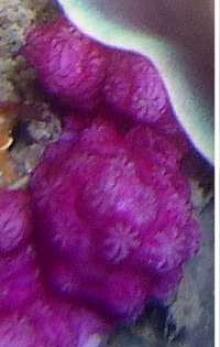 I am pretty sure from your photo that this animal is feeding on the purple soft coral colony in your photo. If you look at the photo on the Fact Sheet you will see that the flap of tissue over the soft coral is not the foot but the oral veil. Also you will see a faint purplish-pink shadow in the nudibranch. This is the branching digestive gland and its colour matches the colour of the soft coral colony quite well. All in all I think you have discovered the food of this species. It would be nice to get this positively identified. It would also be nice to get some further records of it feeding to confirm the information, and also to check whether you ever find it on a gorgonian, which is its other possble food.