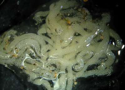 Paul's recent description of Bulla quoyii egg masses sounded quite familiar. In Feb 2003, I collected what looked like a completely white Aplysia egg mass under a boulder near some algae in Wollongong. Usually when these egg masses are so pale, it is a sign that they have hatched or are completely inviable. However, when I examined the eggs in this mass under the microscope, I found that almost all of them were developing quite happily, 1 to each capsule.