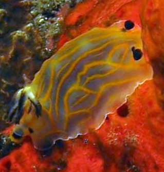 Here are some more of Yves Coze's photos showing colour variation in Halgerda formosa which he and his colleagues have spotted in Reunion Island. This photo shows the red sponge it is often found on.