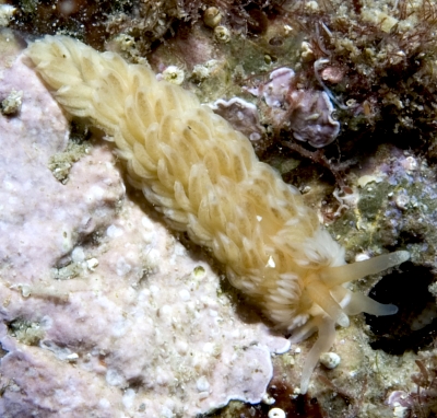 The best external character in A. alderi, which appears to be unique to this species, is the size of the cnidosac in the anterior row of cerata. In the close-up alongside you can clearly see that the cnidosac in each of the anterior cerata is proportionally much larger - occupying more than half the ceratal length - when compared with other cerata in the animal. Because these larger white cnidosacs replace much of the digestive gland in these anterior cerata, the cerata appear white, and make the aeolid look as though it has a white collar or 'ruff' around its neck.