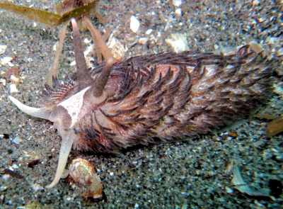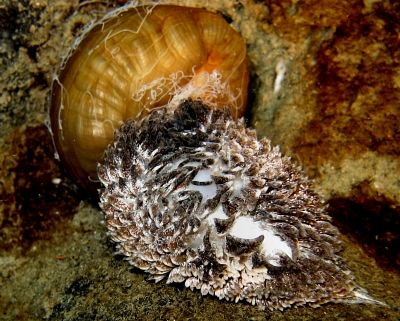 Up here we call them the 'shaggy mouse' for good reason. They range in color from gold to dark brown with the majority in shades of brown or grey and resemble their namesake very much. I was wondering why ours are so dark. Could it be a subspecies or maybe just because there is so much dark color present in our waters up here. Their main food up here is the plumose anemone as you see in the upper picture.