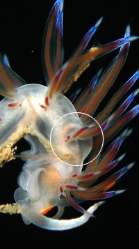 This Cratena must have been down to the last polyp when you found it. I think you have made an excellent choice of photos. Since the skin of these animals is quite transparent you can often see internal structures. In this case I have put a ring around a curved tube which is the intestine, running from the stomach to the anus, which is obscured just behind one of the small cerata. Part of the duct is filled with an orange substance, which is the remains of the hydroids Cratena has been feeding on.