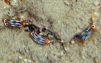 I noticed first that there is a slug skewered on the thorn-like fin rays of the Lion fish, then I noticed the murderer has some more victims. The other slugs look quite lively on the picture but I remember they looked quite dead and motionless (even for slugs).