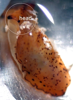 In this animal almost all the outer half of the mantle has been broken off so in the top photo the head [and neck] are clearly visible and in the lower photo we can see part of the gill on the right side.