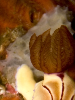 Thanks very much for this observation. The slug has certainly had a meal of the part of that part of the colony, only the fibrous bundles that make up its skeleton are still present. I assume the whitish sponge it is sitting on is part of the same colony. From the arrangement of the fibres I am pretty sure it is a species of Dysidea which would fit with the only other record we have of its food choice [message #11334 ]