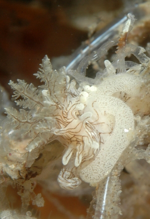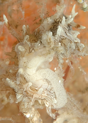We encountered Okenia pellucida at Port Stephens again. We found it by the prolific egg rings in the host bryozoan. The Okenia were difficult to see because they were so tiny. We used the minimum focus 1:1 of our macro lens to even see them. We could see this pair with eggs actually wrapped around them and think we have caught them in the act of laying the eggs. What do you think?