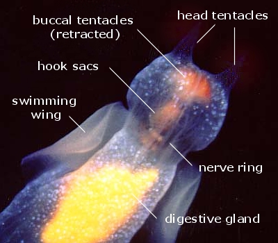 Thanks for the wonderful photo. The pelagic opisthobranchs are fascinating animals. They are sometimes called sea butterflies for obvious reasons. I have labelled an enlarged version of the front end to show some of its distinctive features. Limacina and related gymnosomatous pteropods are voracious hunters feeding almost exclusively on their cousins the thecosomatous or shelled pteropods. Their buccal apparatus includes extensile buccal tentacles that are used to capture the prey, and hooks surrounding the radular teeth to drag it into the mouth.