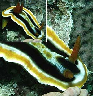 In your message about Chromodoris magnifica one of the photos you suspect may not be C. magnifica is most probably C. annae. I have copied it alongside. The characteristic punctate blue pattern is clearly visible. If I have identified it correctly, it looks as though it can have a central row of pigment - in this case orange brown. It is from Hoga Is., Sulawesi, Indonesia. Oct 1997.