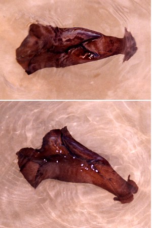 Here some pictures of a swimming Sea Hare from a sandy beach on the Mediterranean coast of Spain. I have seen lots of them in the last three years during my annual visits. Before then I had never seen any, which is very strange, because I'm a regular visitor. They are brown to almost black in color and their size varies from 15 to ca. 35 cm. I haven't seen any of this Mediterranian type on the Forum so I hope these pictures can be of some help.