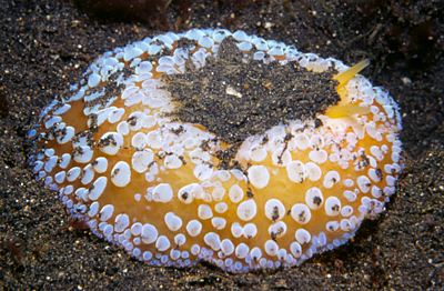 I photographed the upper one on a night dive on a silty sand slope called Hairball in August, 200l. I shot the other two images on the night of November 20, 2002, at the same divesite. Both animals were about 15cm long and about 5 meters deep. Although I photographed them 15 months apart, I suspect they are the same specimen. In the Nov. 2002 picture the shell is elevated, revealing the eyespots and a bit of the gills.