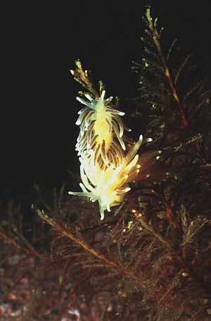 The photo was taken on the artificial reef, HMCS Saguenay, off Lunenburg, Nova Scotia, Canada this past summer. The wreck is covered in hydroids, sponges, anemones (M. senile) and nudibranchs. These two nudibranchs were at a depth of about 22 meters. They were not large, maybe 15 millimeters at best.