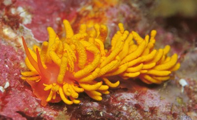 I found this Phestilla melanobrachia in the Andaman Sea in southern Myanmar. It was sitting at the base of the central pinnacle at Three Islets on Feb.14, 2003. It was 21mm long and the depth was 12 meters. There is a lot of both orange and green Tubastrea coral on this reef. Mark Strickland told me the orange form of these slugs is seen occasionally in this area.