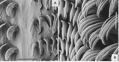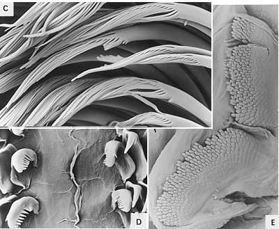 From Figure 5. Rostanga arbutus, radular morphology of small specimens from northern New South Wales A, B (AM C81416), C (AM C152074), and Sydney D (AM C151168). A, Central region and inner right side; B, transition zone between inner right laterals and outer brush-like laterals; C, brush-like tips of outermost right lateral teeth; D, central region; E, chitinous lining of roof of buccal cavity flattened out to show jaw plates, anterior edge of jaw plates on left side, AM C125205. Scale bar = 30 µm in all cases, Photo G. J. Avern. [Rudman, W.B. & Avern, G.J. (1989). The genus Rostanga Bergh, 1879 (Nudibranchia: Dorididae) in the Indo-West Pacific. Zoological Journal of the Linnean Society 96: 281-338.]