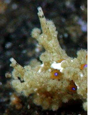 Body shape: "A. exeches has a very elongate body with extremely elevated, unique tubercles ... they are nearly mushroomed shaped, with a flat crown and completely cover the dorsum." From photos on the Forum, including ones I have just posted [#14229 ], the tubercles of Indo-West Pacific animals are spaced in quite regular arrangements, and the typical colour pattern, which is on the dorsum, is hardly ever obscured. More importantly, the shape of the tubercles is plastic, sometimes a tubercle will be rounded at the tip, but it is capable of opening out to form a flattened top [see #14229]. This would also explain the difference in tubercle shape in d'Orbigny's and Alder & Hancock's illustrations of A. punctilucens.