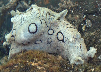If you look carefully at the enlarged photo alongside I hope you can see some very small black rings with a white centre in the dark grey patches. That would normally indicate that this is a color form of Aplysia oculifera which has tiny rings like this. However the parapodial flaps look thick, leathery, and are not very folded, which is quite unlike that species. I suspect this is an extreme colour form of Aplysia dactylomela. Both species occur in southern Africa and have a long history of being mixed up in South African publications, so I could just be joining the confusion, but in extreme colour forms of these two species I think the general body shape is a better indicator of identity than the size of the black rings.
