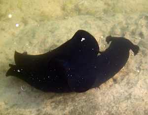 It was about 2ft long, black, with large flapping 'wings' for swimming. I don't even know where to start in its identification. I am only guessing that it it a sea slug. Might manage a photo if it is a sea slug