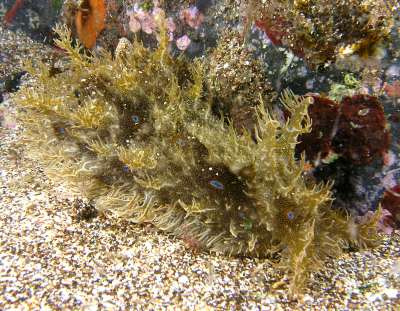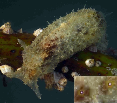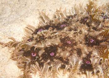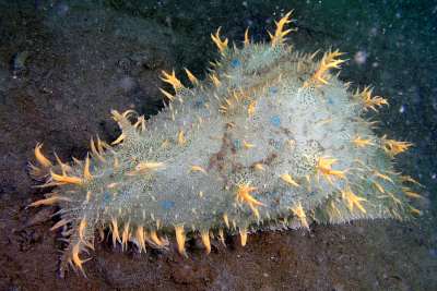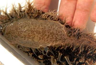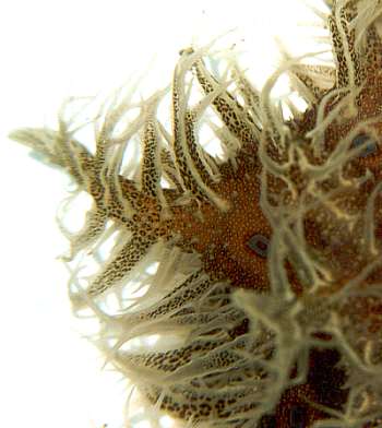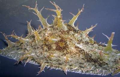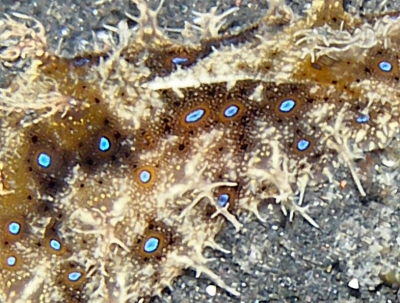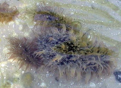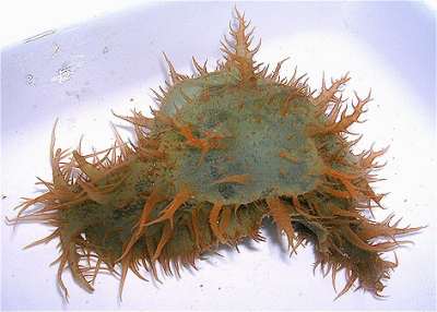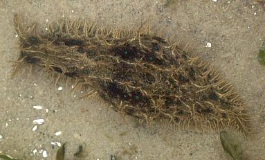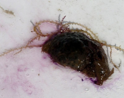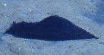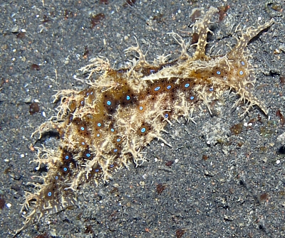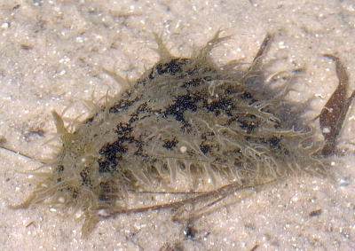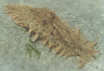 Approx. 12 cm in length, and 4-5 cm width. very soft skin(?), covered by bushy like appendages (probably the wrong word to describe them) Purple-brown in colour. Also has v.small green coloured circular markings over its surface. Also seems to respirate, or pump water in and then out two openings on its back intermittently. I have alos seen it slurp its way to the top of the tank or a filter, jump off and roll itself into a ball, and float down to the bottom. I think it has also been feeding on the algae on the side of the tank, not unlike the freshwater snails I have in some of my other tanks