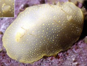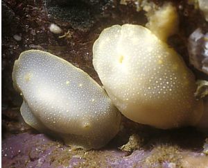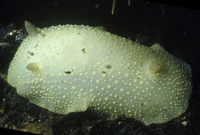 The first shows the gills about half out (They retract the gills when disturbed, so it is hard to photograph them). The grey area to the right is the sponge the animal eats. The animals are cream - white and semi-transparent; I wouldn't call them greenish. The tubercles are yellow.