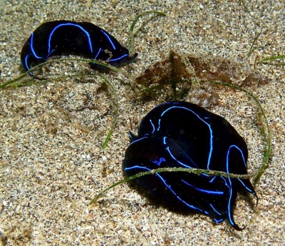 Looking through earlier messages on this species, there are a number of observations of three animals 'pairing'. Like all sea slugs, species of Chelidonura are hermaphrodite, with fully functional male and female reproductive systems. In nudibranchs, the male and female organs open together on the right side of the body so for physical reasons only two animals can mate at one time, but when they do so they can act as both male and female at the same time. However in aglajids, like Chelidonura, and in Sea Hares, the male organ - the penis - is situated on the right side of the head, while the female opening is at the posterior end of the body on the right side. This means that when a pair mate, one usually acts as the female, and the other as the male. It also means that if there are more than two animals present they can form a mating chain with the one at the front acting as a female, the one at the back acting solely as a male, but the one[s] in the middle can act as both.