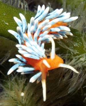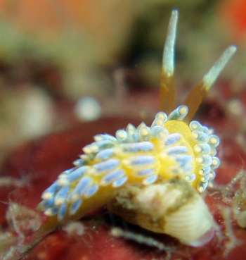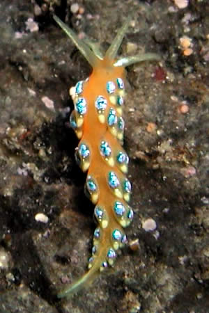 Background colour of the body translucent orange. The oral tentacles and smooth tapering rhinophores are translucent watery orange at the base, changing to a translucent yellow about halfway up. There can sometimes be a pair of bluish white lines of the head running from in front of the rhinophores to along the basal half of the oral tentacles. The most distinctive colour feature of this species is the bright blue digestive gland which colours the cerata except for an apical bright yellow cap. In some cases the upper part of the digestive gland can be a blackish colour so that cerata looks as though it is bright blue with a black band then a yellow cap. It can grow to 15mm long.