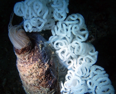 Animal feeding on Pachycerianthus fimbriatus at Chup Point in Barkley Sound, British Columbia, Canada, 40 feet of water on sandy bottom with many Pachycerianthus, 27 November 2000. Photo: Ray Izumi