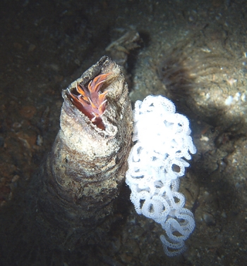 Attached is a specimen caught in flagrante delicto at Chup Point in Barkley Sound, British Columbia, in 40 feet of water on sandy bottom littered with Pachycerianthus fimbriatus, temperature 46F, 27 Nov. 2000.