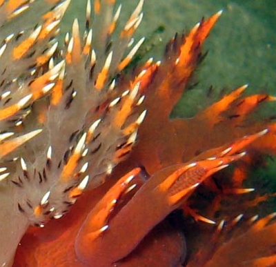 I noticed that the nudibranch seems to locate its prey (the burrowing anemone Pachycerianthus fimbriatus) by touch. Watching macro video of the "strike", I could see clearly that the oral tentacles seem to react strongly to the touch of the anemone's stinging tentacles by quickly withdrawing.