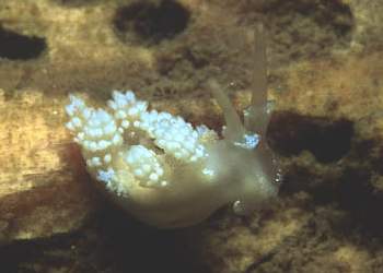 'Body translucent white; tentacle sheaths and dorsal papillae covered with flake-like specks. Length approx 0.5 inches. Dorsal papillae - about 8 down each side, covered with numerous short obtuse or rounded small white-tipped papillae."