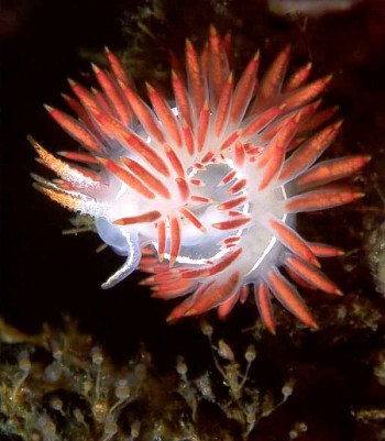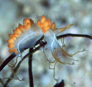 Here is an interesting one for you. Last year my wife and I were photographing juvenile Flabellina trilineata nudibranchs feeding on