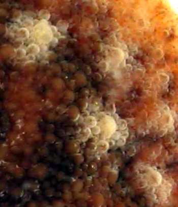 Here are pictures showing the acid glands, which form a stellate [starlike] pattern on the mantle, and spawn coil of Geitodoris planata to accompany my other photos. The spawn coil has a more fluted edge than that of Archidoris pseudoargus.