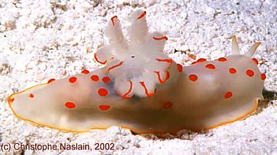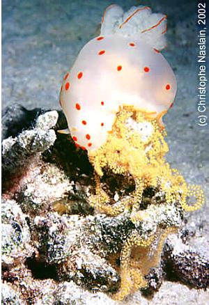 First reported by Kelaart from Sri Lanka this widespread Indo-West Pacific species was next reported from the Society Islands in the western Pacific by Pease (as Trevelyana picta). It is characterised by the translucent white body with small bright orange-red spots and large orange-lined white gills.