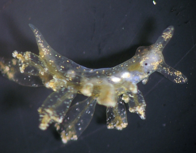 I understand that the two small white swellings visible on the right side behind and below the eye are the separate male and female pores with the male to the fore. The body as well as the cerata is basically transparent, except for some colour spots, allowing the full length of the digestive diverticulum and organs to be visible. Could the dark colour patch on the left side at the "neck" behind the eyes be food in the oesophageal diverticulum?