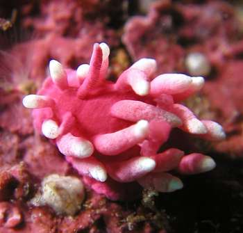 This bright pink animal has a row of large finger-like papillae around the edge of the mantle. They are pink with a whitish tip. There is also one papilla in the centre of the back and a few extra on each side forming a sparse inner row of papillae. The few small pink gills form a row across the mantle just behind halfway. This species feeds on a similarly coloured pink encrusting bryozoan. It grows to 8 mm in length.