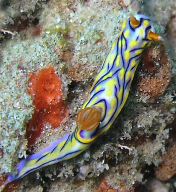In both these photos and those of Hypselodoris regina [message #21141 ] your animals are crawling in an area with many colonies of an orange sponge which I doubt is their food. Supporting that idea is the fact that in all the photos the slugs seem to be avoiding the orange-red colonies.