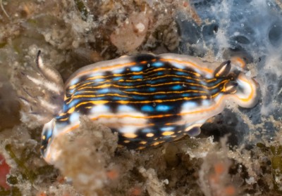 It's certainly interesting to compare this juvenile with the adults in your other message [#15078]. As you note, in this animal there are only 3 longitudinal yellow lines and no indication of the light blue colouration. The white patches on the rhinophores are present, and so provide a useful link between the different colour forms, but the gills have yet to develop their white colouration and so appear blue.