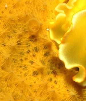 This is Noumea crocea, one of a number of yellow species of chromodorid[see N. flava colour group], which are very well camouflaged on their food sponges. If you look at the other messages on this species you will see we have two other records of N. crocea on this bright yellow species of Darwinella. It is good to get further confirmation that this is its preferred food.