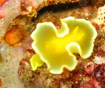 The wall is heavily covered in both hard and soft corals as opposed to a sandy or rubbly bottom. The body was entirely translucent yellow with white edges to the mantle which would 'ripple' as it moved - a muscular induced movement rather than caused by motion through the water. Length - approx 2.5 cms.