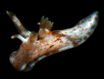 David and I found an Okenia sp. each at the same time! It is very interesting the way the 6 processes are surrounding the gills and rhinophores. The group is centrally located on the dorsum. The head seems very long.