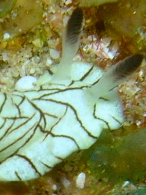This is possibly the species of Paradoris, recently described recently by Dayrat, (2006: 209-216, Figs 57C-E) but not actually named. He identified it as Paradoris sp. B. It is translucent with closely placed opaque white spots and some elongate black streaks. The black streaks are shorter than the lines in the Sth African animals but are otherwise quite similar.