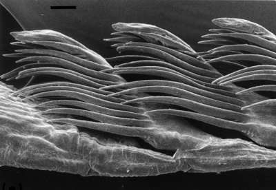 PHOTOS: SEM photos of the radula of Phestilla panamica (upper right, lower right - 17 mm long preserved) and Phestilla lugubris (lower left - 8 mm long alive). Scale bars = 20 µm. Photos: G. Avern.