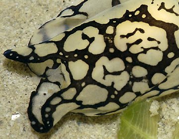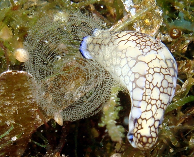 This species was described by Eliot (1903) from Wasin Is, off Kenya and has not been reported since. I found specimens in Tanzania in the 1970s, one is illustrated here, and another was identical in colour to a specimen from Sulawesi, Indonesia, illustrated in Lindsay Warren's message below. Also in that message I have added a copy of Eliot's illustration of the species. The body colour ranges from white to dull yellow and there is a reticulate pattern of brown to black all over the body, including the sole of the foot. There are blue markings on the inside edge of the anterior part of the parapodia and along the outer edge of the parapodia.